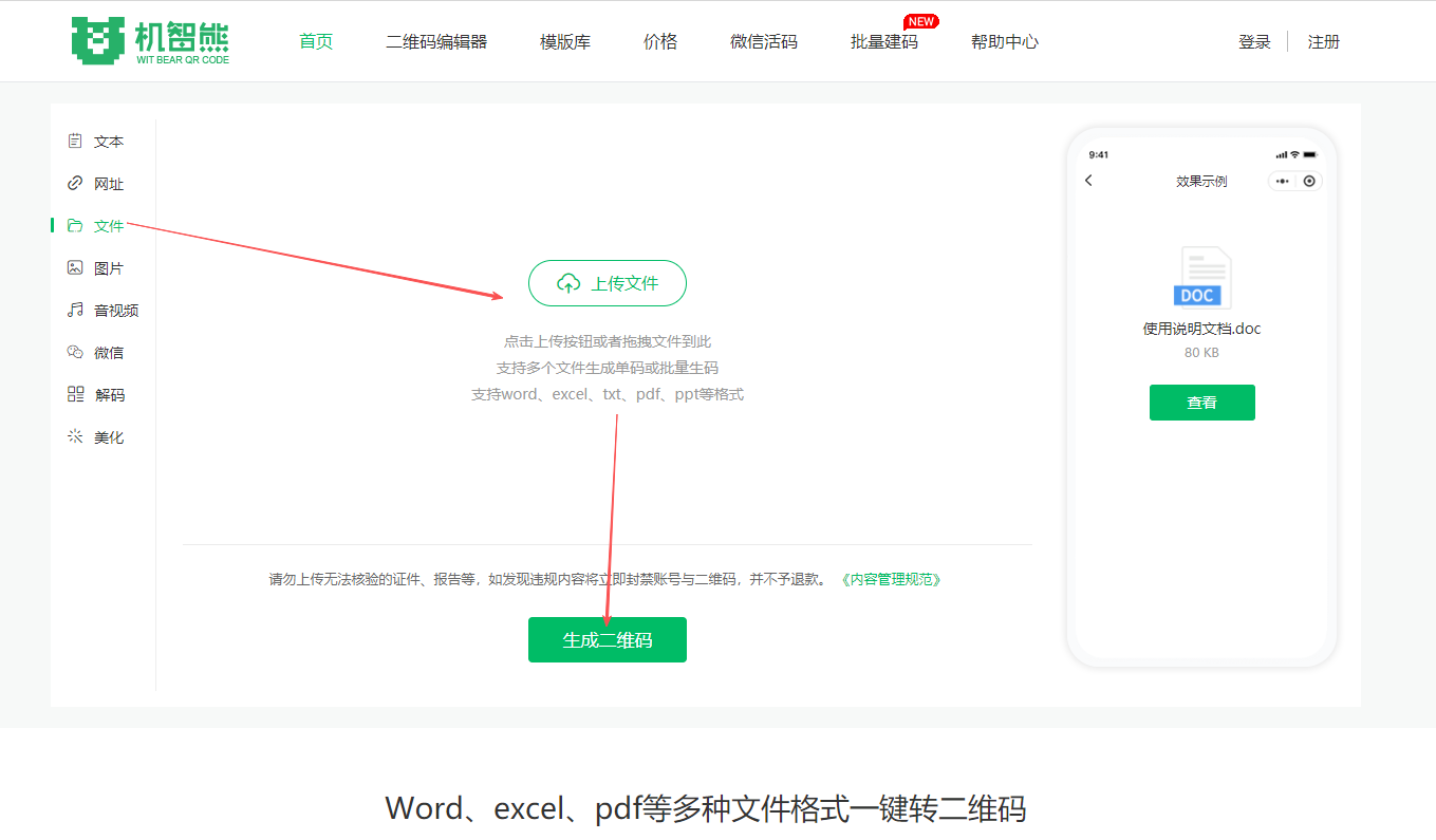 内容兼容广,制作超简单:不仅支持链接,更能将PDF、Word、PPT、Excel、音视频等文件直接转换成二维码。用户扫码即可在线预览或下载,极大便利了教育机构的资料分发、建筑行业的图纸更新等场景。