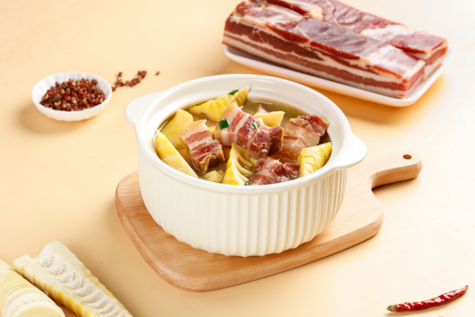 做这道菜,选材是第一步。春笋要挑那种笋壳紧实、根部白嫩、拿在手里沉甸甸的,这样的笋才够新鲜脆嫩。腊肉则最好选肥瘦相间的五花腊肉,太瘦口感偏柴,太肥又容易腻口。