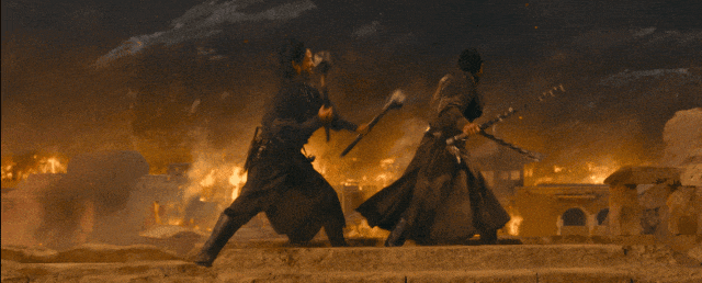 黄沙漫卷、夜色深沉、白雪皑皑、烈火熊熊,每一处布景都像一幅精心勾勒的画卷,尤其是片尾一群人踏马奔赴长安的镜头,山峦叠嶂间,马蹄跃过潺潺溪水,溅起的水花与层林尽染的五彩交织,既有江湖豪情的雄浑,又有东方意境的悠扬,将中式武侠的浪漫与悲壮展现得淋漓尽致。