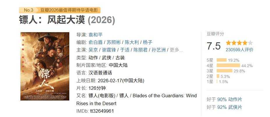 上映三七天,票房破8亿、评分7.5分的《镖人:风起大漠》,被很多观众认为应该有更好的成绩。