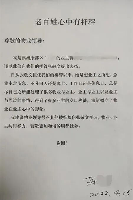 小编已经不记得这是张敬文第几次收到表扬信了。张敬文在疫情期间,为社区老人取过药,探望并陪隔离户老人谈心。业主家装修时,外飘窗漏水,她留心记下,待项目做楼顶防水工程时,帮助协调一起给业主修复漏水问题。业主母亲不慎摔伤胳膊,她时常去探望阿姨,并利用自己的休息时间陪阿姨去医院复查。业主房屋出租,有问题就会微信联系张敬文,每次她都会把问题处理好,并且及时回复业主。