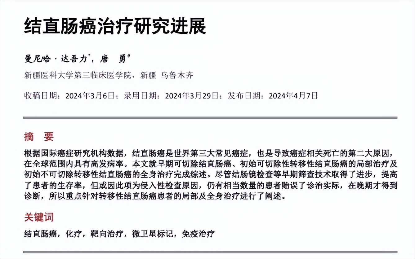 参考资料[1]曼尼哈·达吾力, 唐勇. 结直肠癌治疗研究进展[J]. 临床医学进展, 2024, 14(4): 198-203.