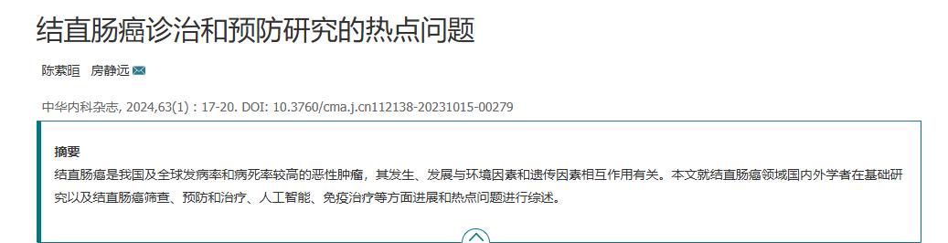 陈萦晅, 房静远. 结直肠癌诊治和预防研究的热点问题 [J] . 中华内科杂志, 2024, 63(1) : 17-20.