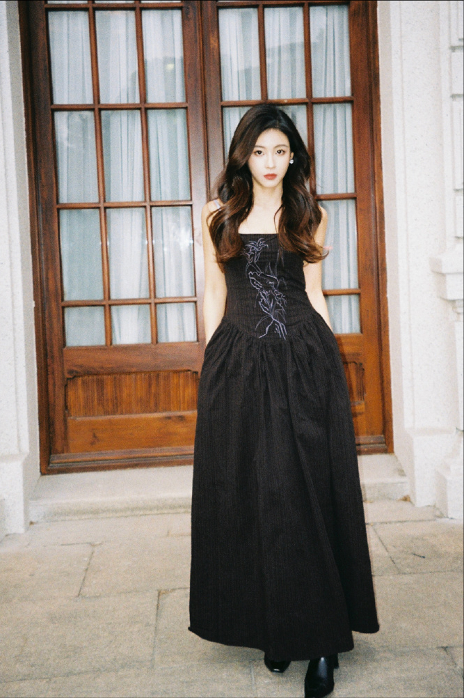 裙子采用了竖条纹设计,经典却又不失时尚感,而她那长长的黑发随风飘动,展现出一种自由又迷人的姿态。即便是在上海的寒冷冬夜,她依然能通过这身服装与自然景色融为一体,呈现出独特的美感。