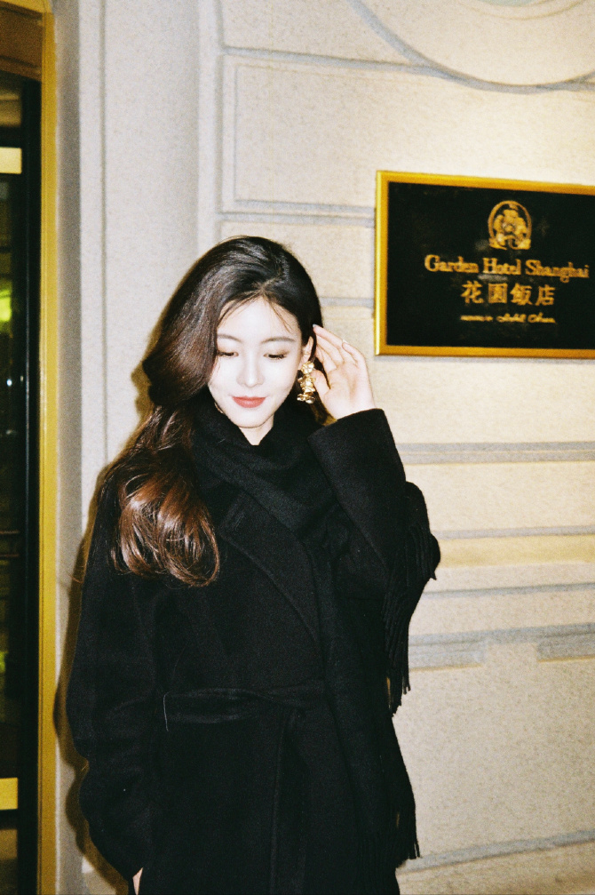 从照片中可以看出,她当天是在上海的花园饭店吃饭,闲暇之余,借景抒情。她用左手把头发挽到耳朵后面,并展示了她极具特色的金色耳环。