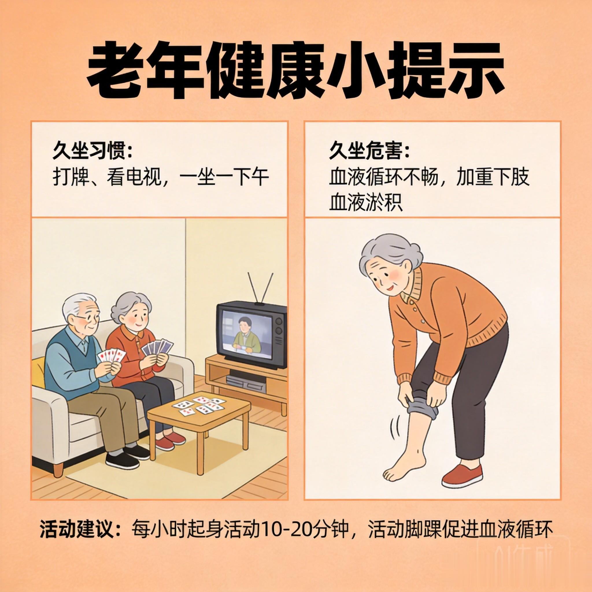 很多老年朋友不爱动,平常喜欢打牌、看电视,一坐一下午。久坐血液循环不通畅,也会加重下肢血液淤积。建议每隔1小时起来走动走动,活动 10-20 分钟左右,活动活动脚踝,促进血液循环。