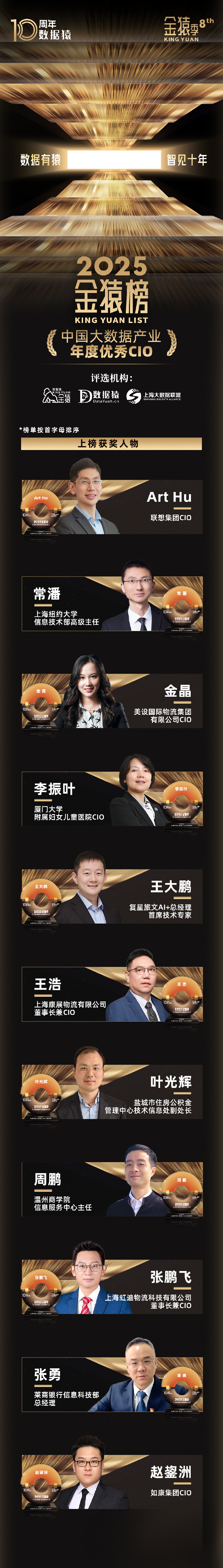 “第八届年度金猿季策划活动——《2025中国大数据产业年度「优秀CIO」》榜单/奖项”由金猿组委会X数据猿X上海大数据联盟共同推出。