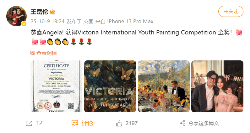 2025年10月9日,李湘和王岳伦在社交平台发布了相同的内容,为女儿王诗龄(Angela)赢得“维多利亚国际青少年绘画大赛”金奖送上祝福。