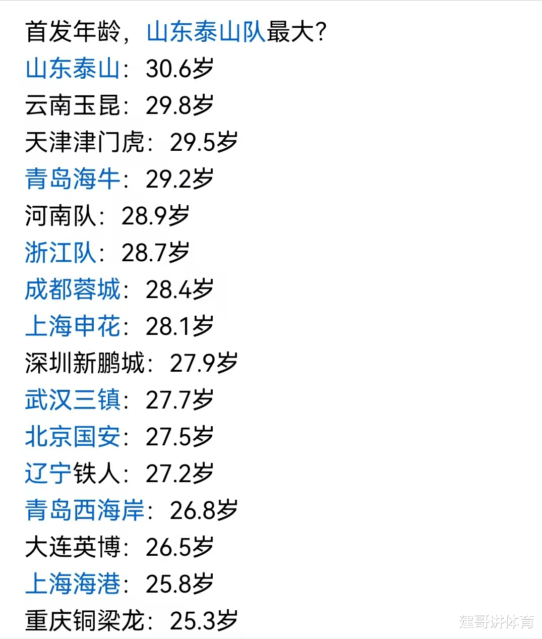 北京时间4月6日,在中超第4轮的比赛全部结束后,迎来了2连败的山东泰山队,因韩鹏在球队落后的时候不上前锋而是选择让老迈后卫郑铮出场,也让韩鹏的用人遭遇到了球迷们质疑,当韩鹏更信任一帮老迈的前队友时,山东某官方媒体记者也整理出一份第4轮中超16支球队的首发年龄名单,比以首发年龄,山东泰山队最大为标题,发出了他的质疑。
