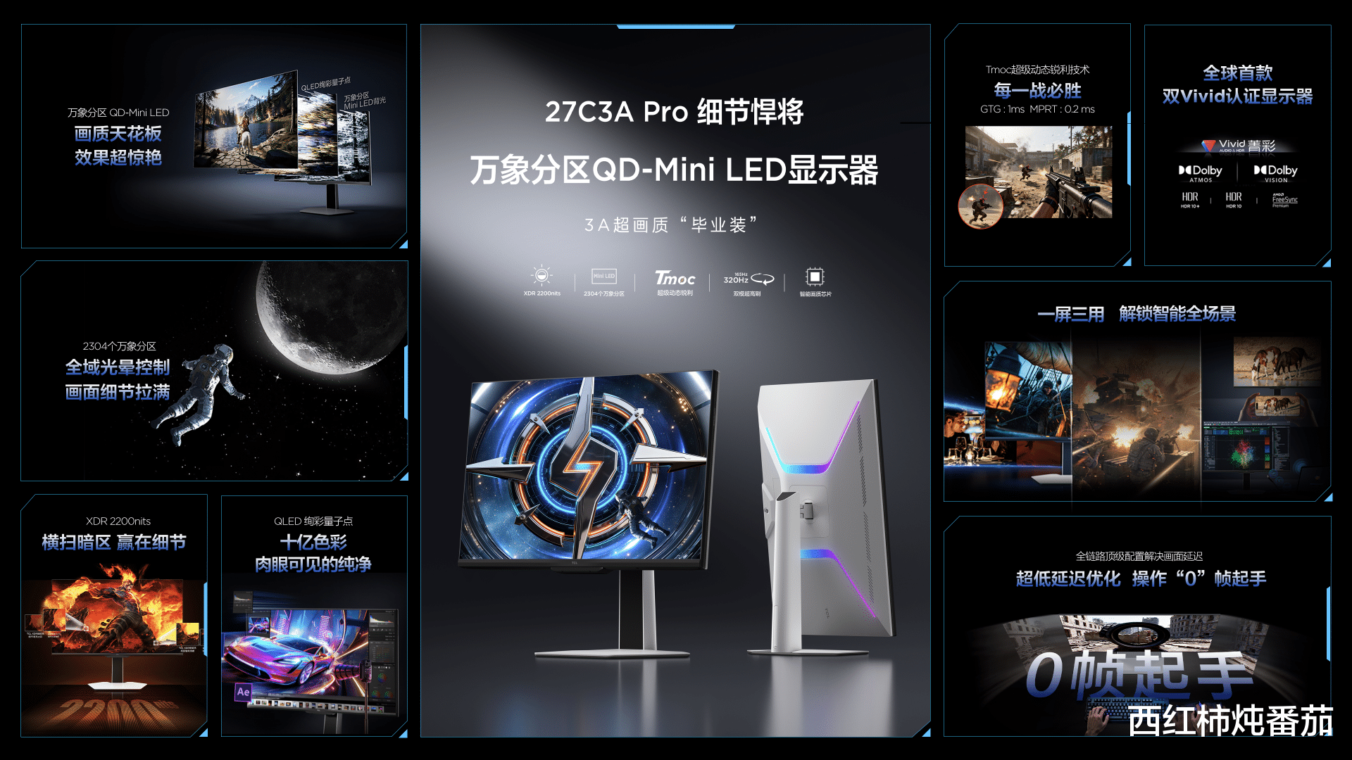 "细节悍将"27C3A Pro专为3A画质狂热者打造,将Mini LED的开创者优势浓缩于桌面方寸之间。2304个万象分区、XDR 2200尼特亮度、QLED绚彩量子点,三大升级构成了对Mini LED显示器发光成像全链路的革新。在《黑神话:悟空》等3A大作中,C3A Pro呈现出的星空场景边缘清晰锐利无光晕,暗场黑得纯粹,亮部细腻通透。这套精准控光系统源于完整的"光链路"升级:从发光效率更高的"聚核光芯",到精准聚光的"超聚光微透镜",再到优化光路的紧凑混光结构,配合TCL华星顶级HFS Shoot屏技术与TCL自研控光算法,最终实现"一区顶多区"的极致控光效果。XDR 2200尼特峰值亮度带来细节拉满的持久细腻亮,QLED绚彩量子点技术实现99% DCI-P3色域覆盖。作为甜品级配置产品,C3A Pro还搭载了Tmoc超级动态锐利技术,轻松切换FPS竞技场,高速画面无拖影不模糊。作为全球首款获得HDR Vivid & Audio Vivid双认证的显示器,C3A Pro堪称当下高画质游戏党的"版本毕业答案"。