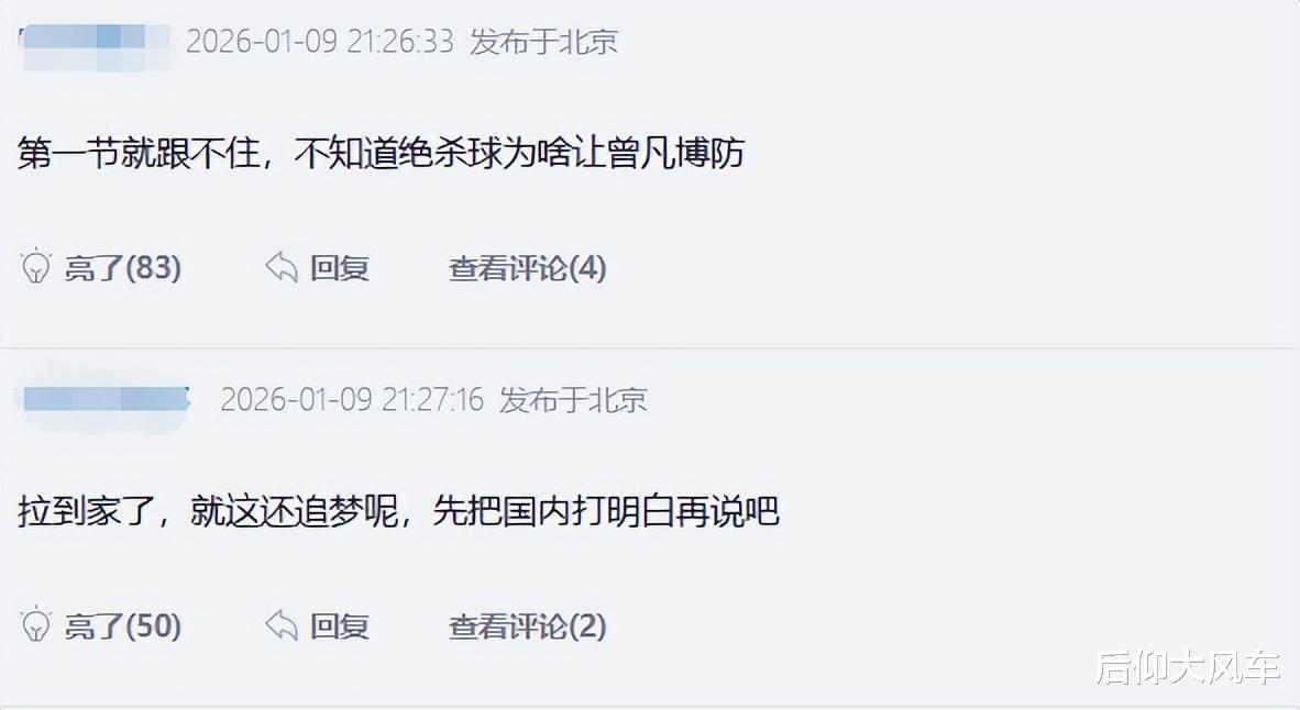 小曾在攻防两端的糟糕表现成了球迷们热议的焦点,有球迷形容小曾本场比赛的表现:没有任何一点防守,没有对抗,没有力量,没有横移,没有阅读。还有球迷直接嘲讽:拉到家了,就这还追梦呢,先把国内打明白再说吧。