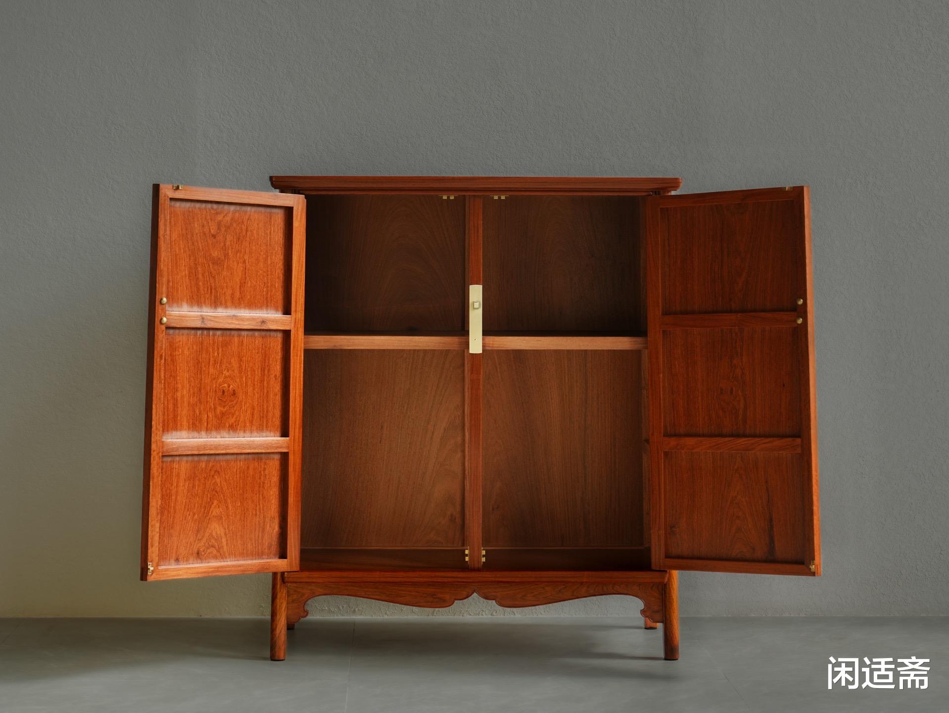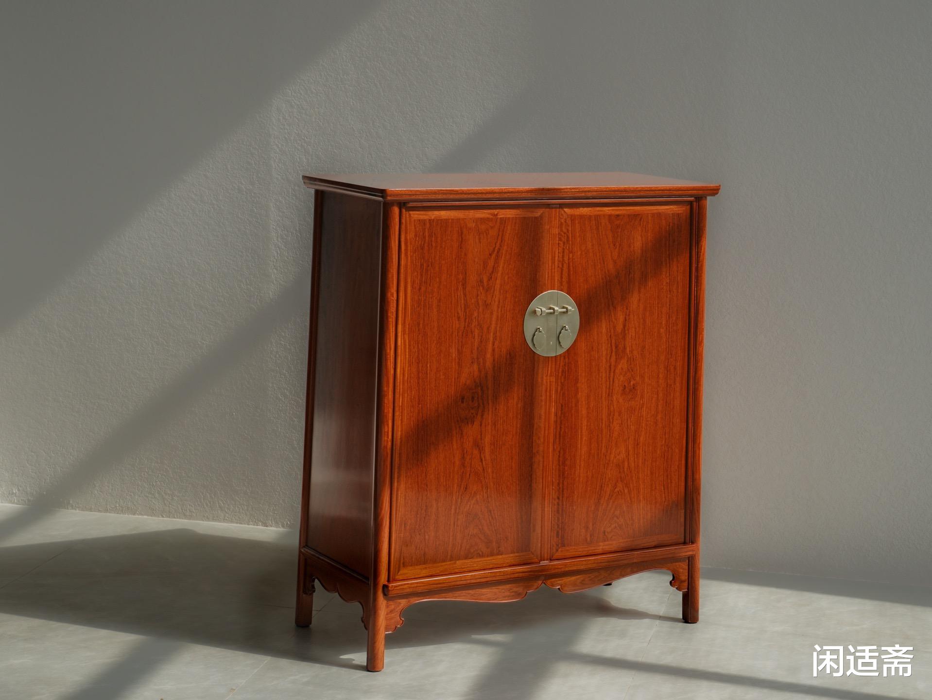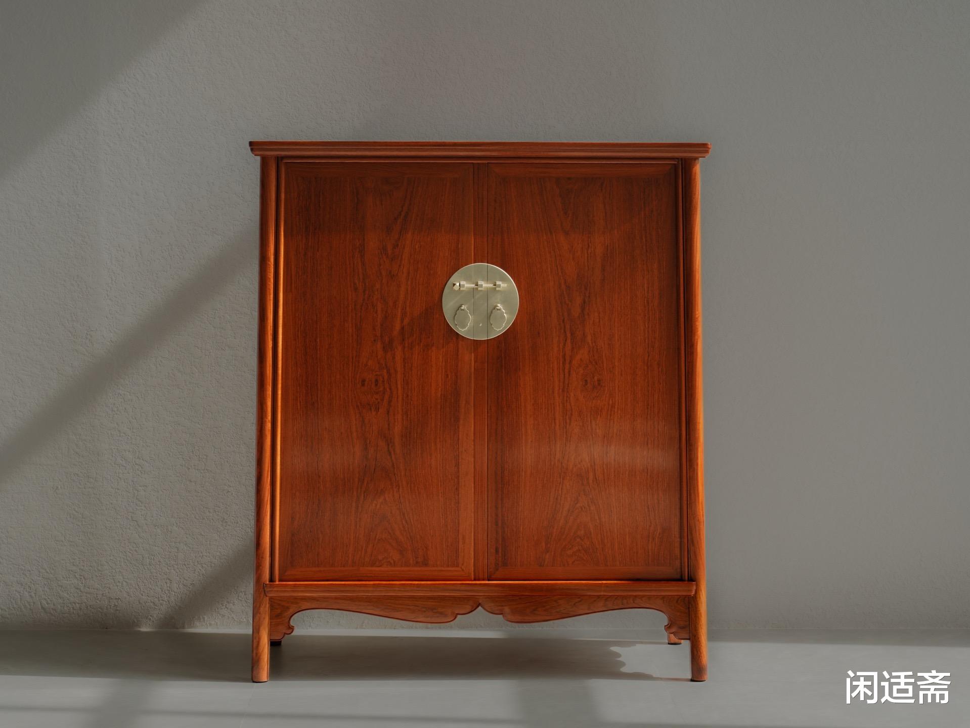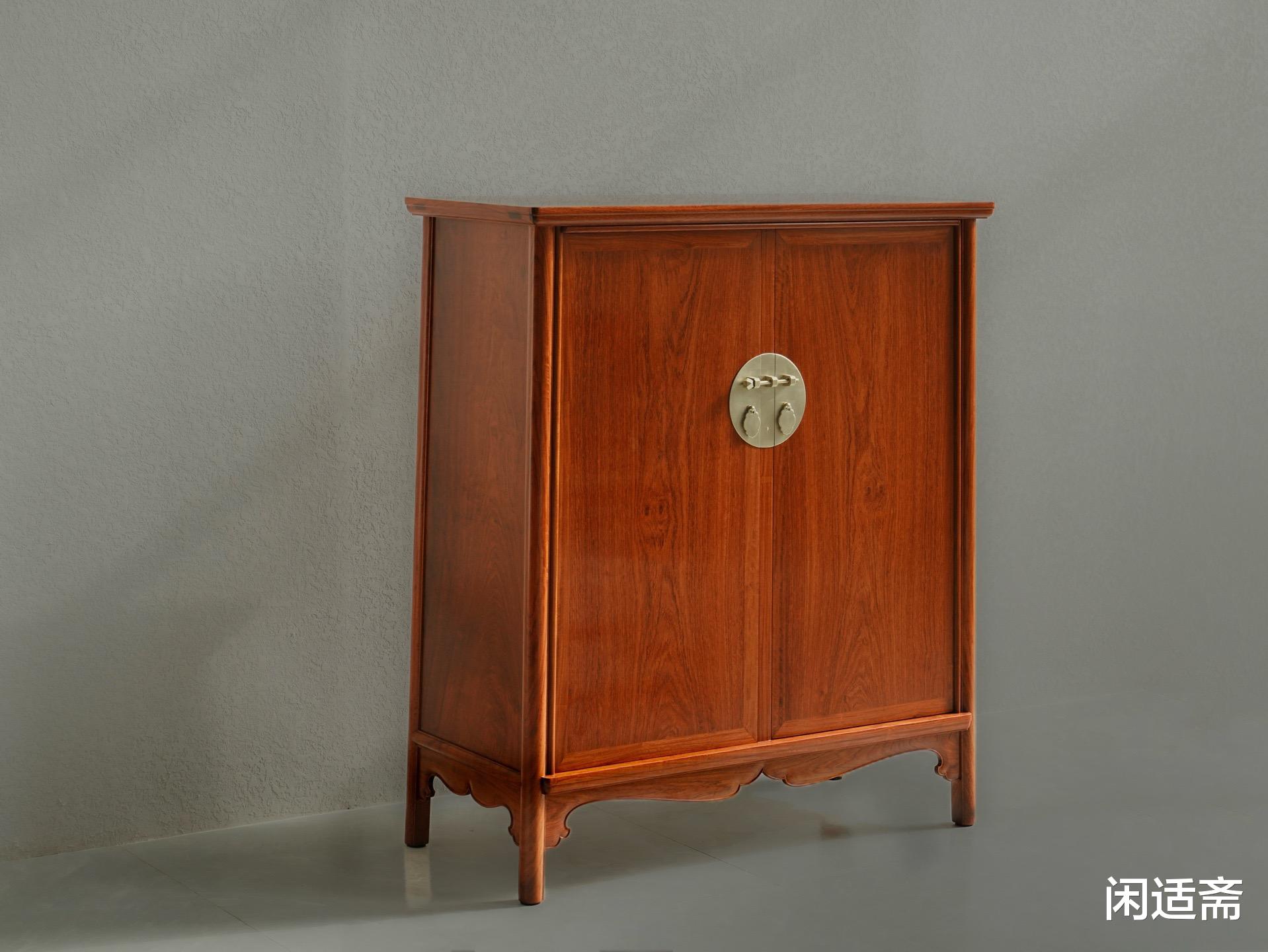 柜体小巧秀气,比例协调,既不占用过多空间,又能满足日常储物需求,可用于收纳书籍、文玩、轻薄衣物等,兼具实用性与陈设性。其简约雅致的造型,适配中式书房、厅堂、玄关等多种场景,可单独陈设,亦可成对摆放,既能作为实用的储物柜,又能作为明式家具摆件,点缀空间格调,彰显主人对明式美学的热爱与高雅品味,是当代复刻明式家具中难得的佳作。
