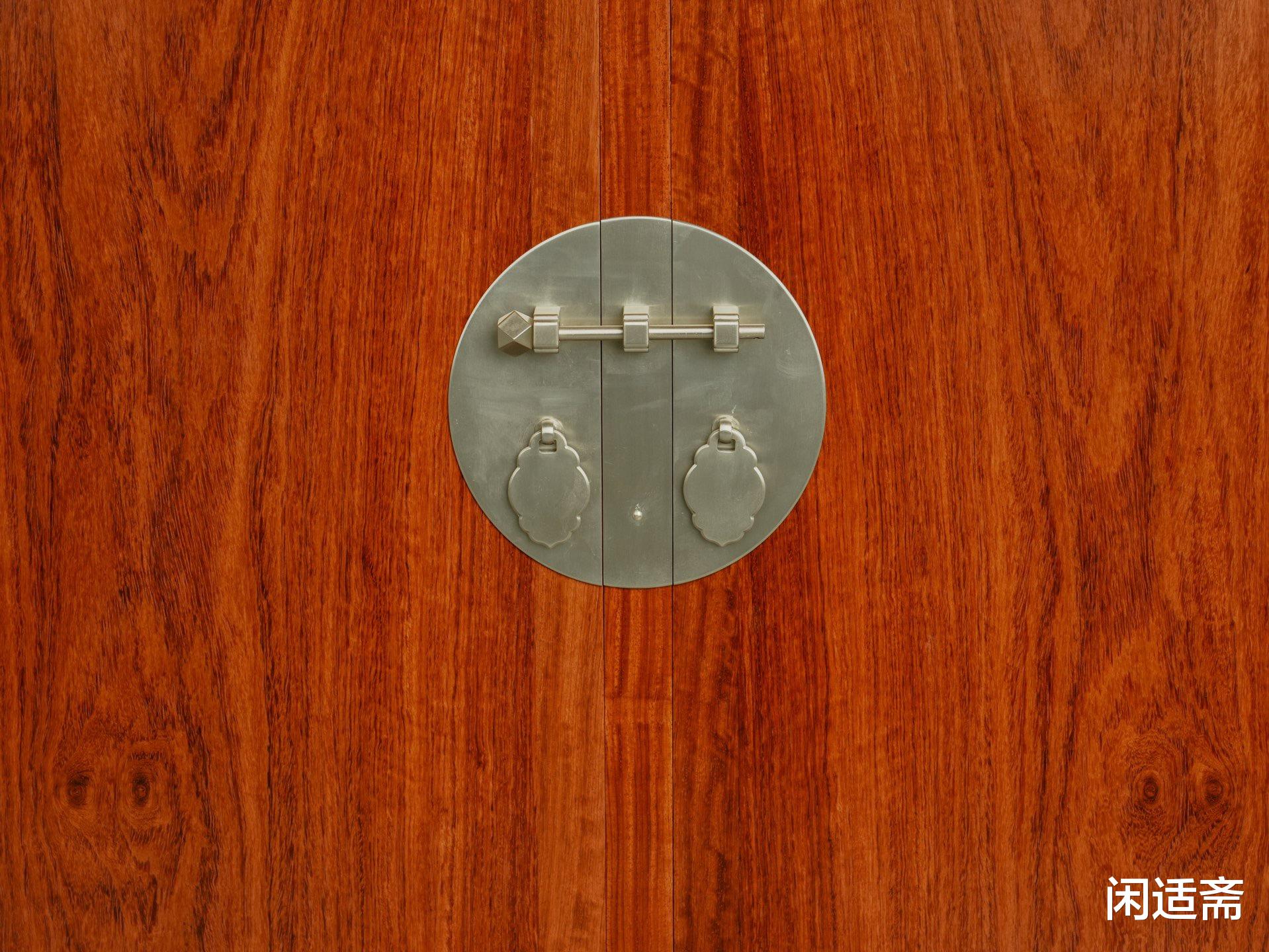 柜门处搭配经典圆形白铜饰件,涵盖面叶、吊牌、合页等,造型简约大气、形制玲珑,色泽柔和温润,与缅花的温润木色形成巧妙呼应,一木一铜、一温一亮,既起到加固衔接、方便开合的实用作用,又为简约的柜体增添了精致感,点睛提亮,尽显明式家具“实用与美观共生”的特质。