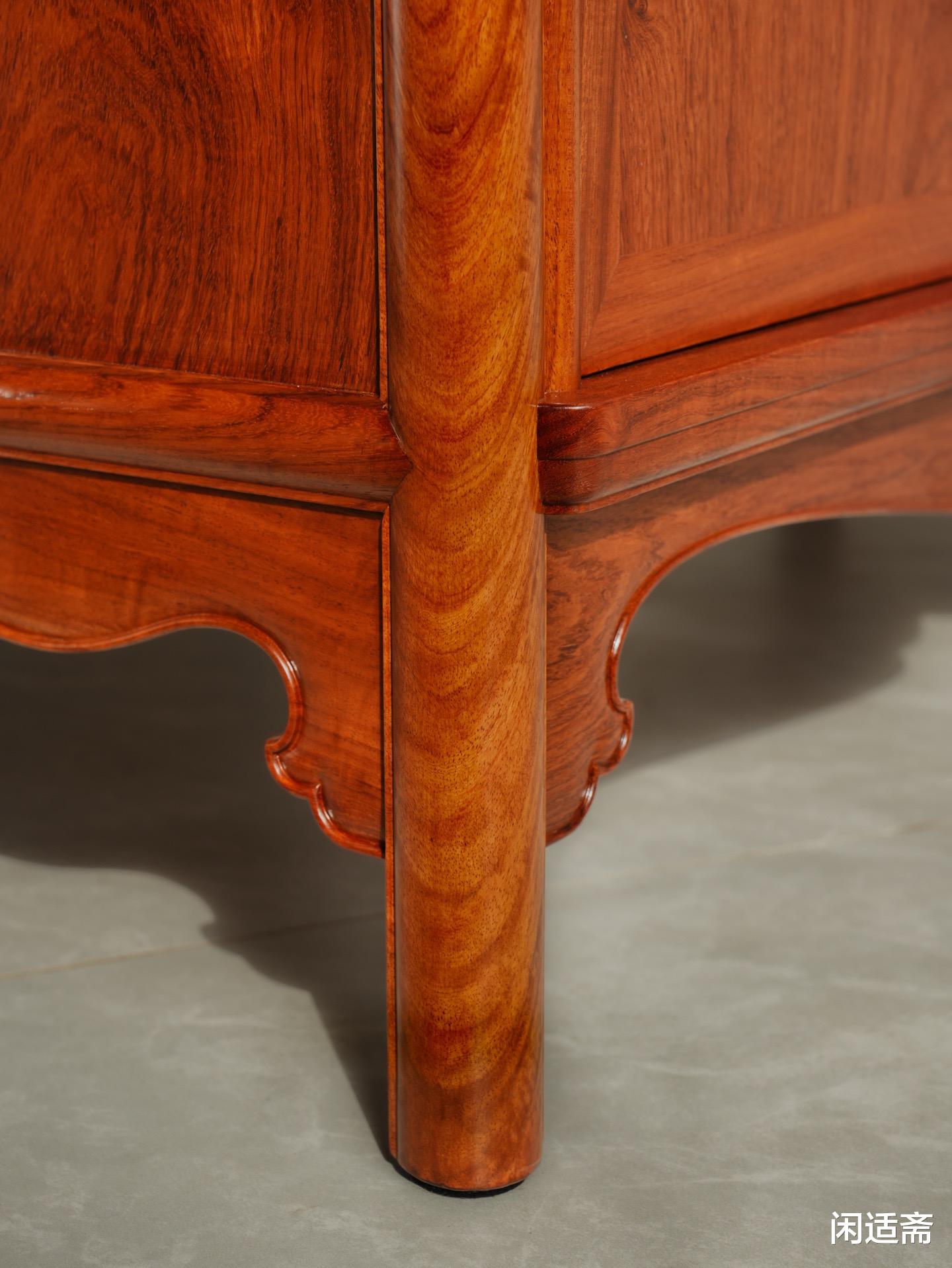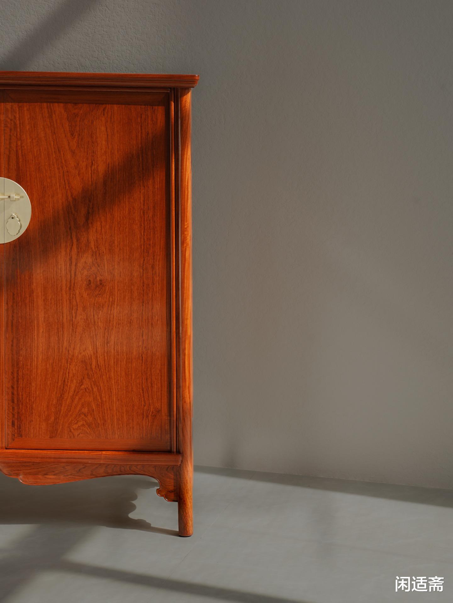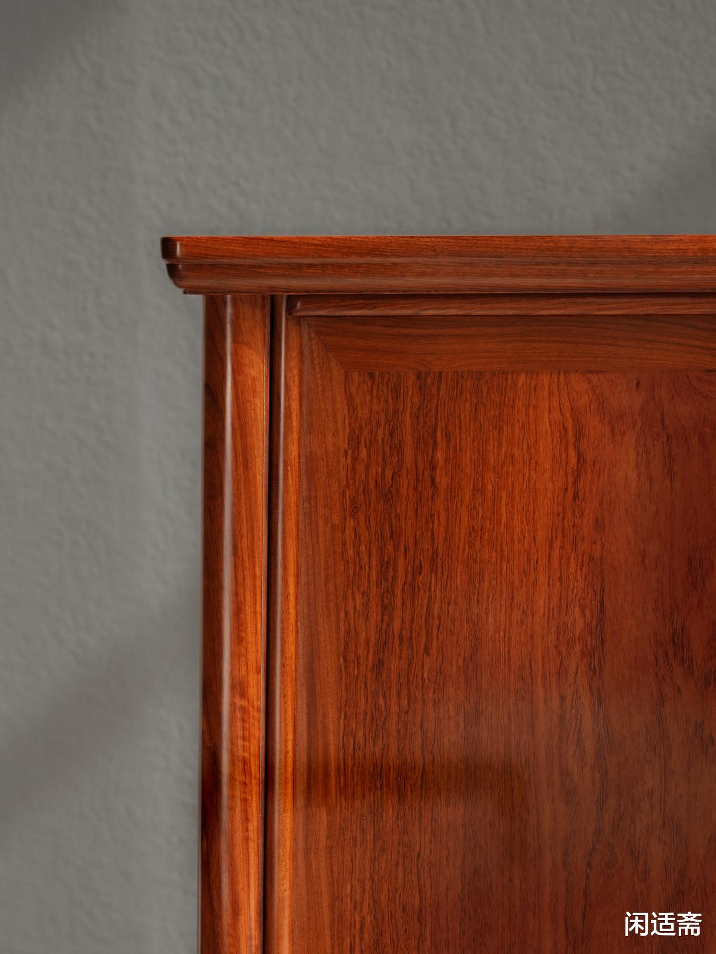 缅花作为国标红木,纹理天然舒展,自带独特木质花果香,色泽醇厚泛琥珀光泽,质地坚韧耐磨,柜体为“上窄下宽”的经典形制,又称“大小头柜”,柜体收分自然,四腿八乍,侧脚明显,远观挺拔轻灵、稳重大气,尽显明式家具的简约风骨。柜帽喷出,四角外倒圆角,线条婉转流畅,规避尖锐棱角的生硬感,既符合人体工学,避免磕碰,又彰显中式器物的含蓄之美。