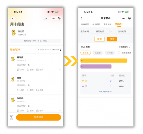 使用接龙管家,所有接龙内收集的信息都可以在线查看,图表统计更清晰。