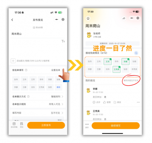 开启【按名单填写】功能,输入全部成员姓名,谁接龙了名单点亮,未接龙者名单为灰色,进度一目了然,不用手动排查。