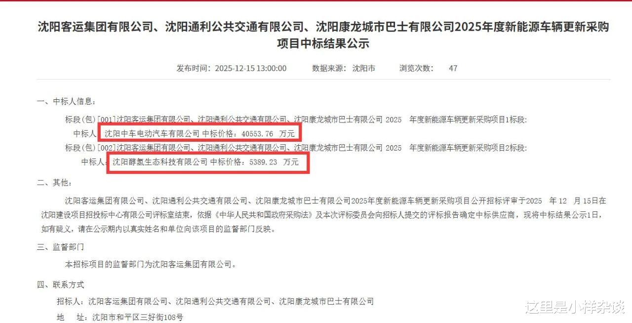 现在这两个公交车更新采购项目中标结果在沈阳市公共资源交易网公布了。582台纯电的公交车订单毫无悬念地花落中车,而77辆新能源公交车也像很多人说得那样是吉利的。
