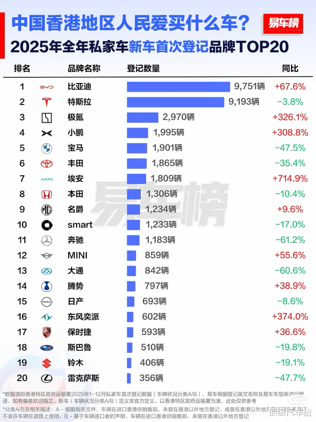 去年年初,比亚迪便已显现领跑态势。香港运输署数据显示,2025年1月比亚迪新车注册量为849辆,登顶单月销量榜首