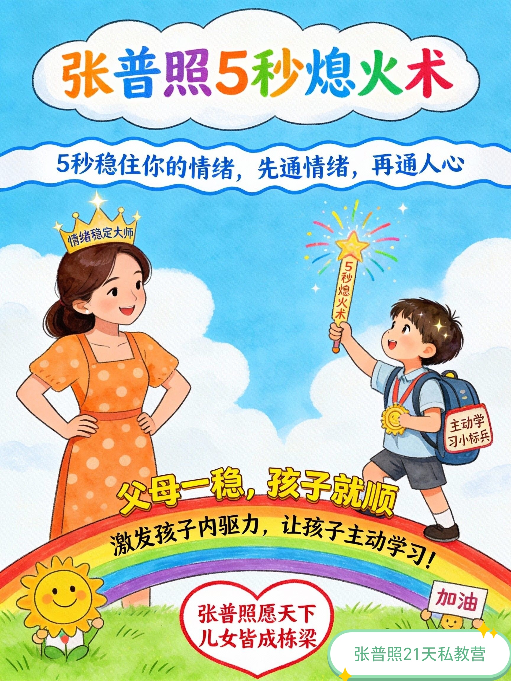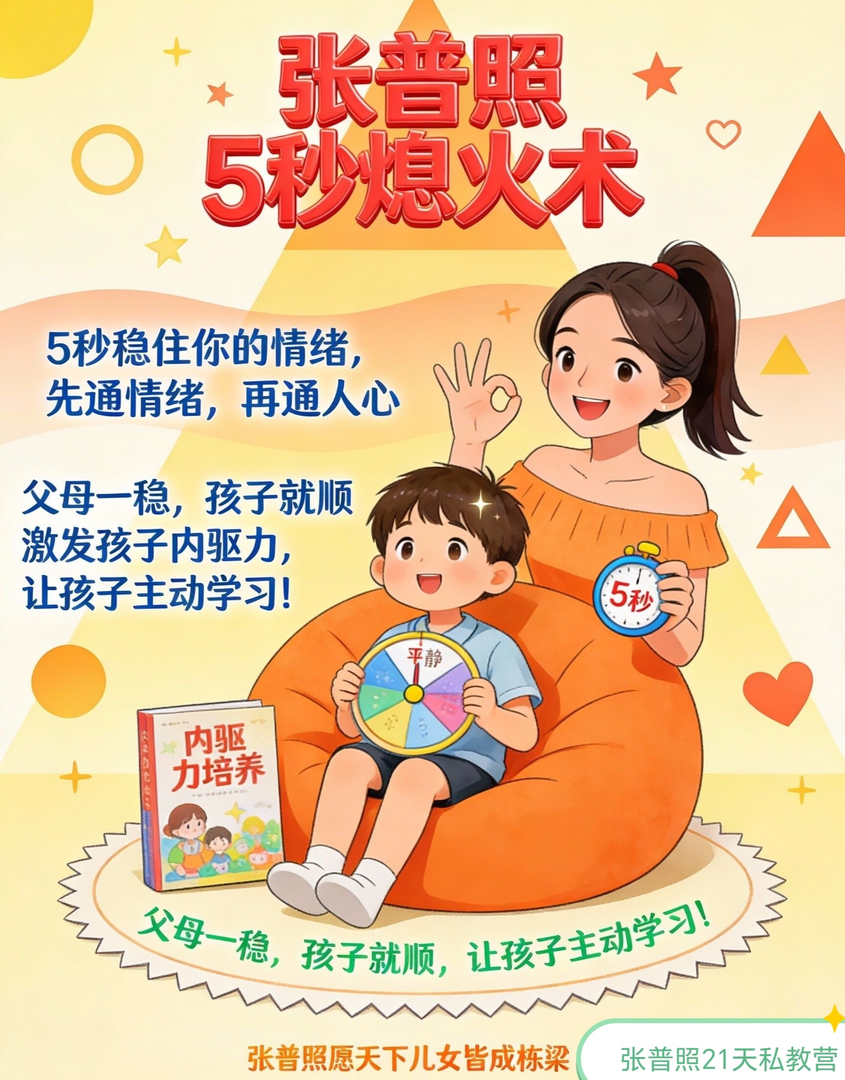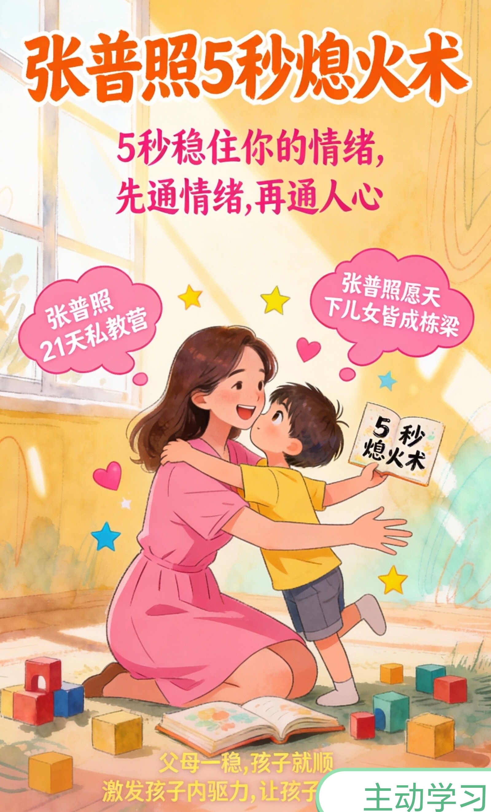 张普照5秒熄火术,就是让你获得这份 “内在安定” 的核心心法。在你快要被育儿的琐碎和压力淹没,情绪即将失控的 关键时刻,给你 一次5秒的“情绪重置”。