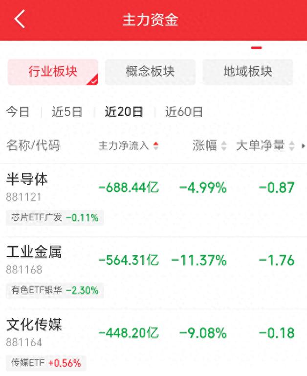 近 20 日,工业金属板块主力资金净流出超564.31亿元,成为全市场资金出逃最严重的板块之一。