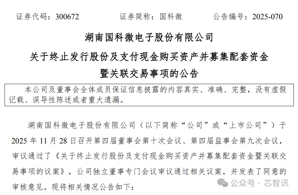 国科微公告称,该公司在11月28日举行的第四届董事会第十次会议、第四届监事会第九次会议上,审议通过了《关于终止发行股份及支付现金购买资产并募集配套资金暨关联交易事项的议案》,同意公司终止发行股份及支付现金购买资产并募集配套资金暨关联交易事项。