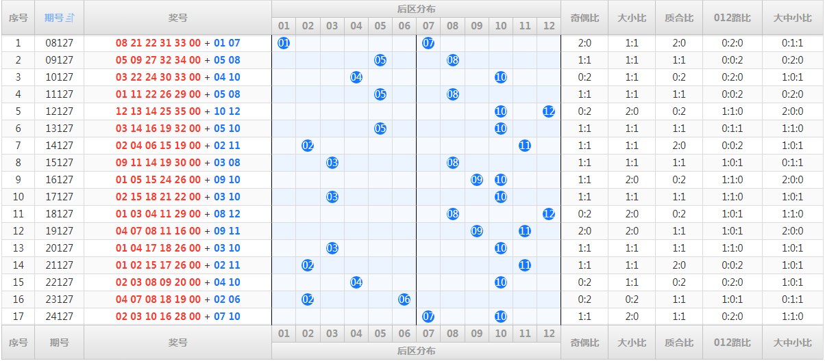 七、历史同期,后区开奖结果和走势图(历史数据演示):