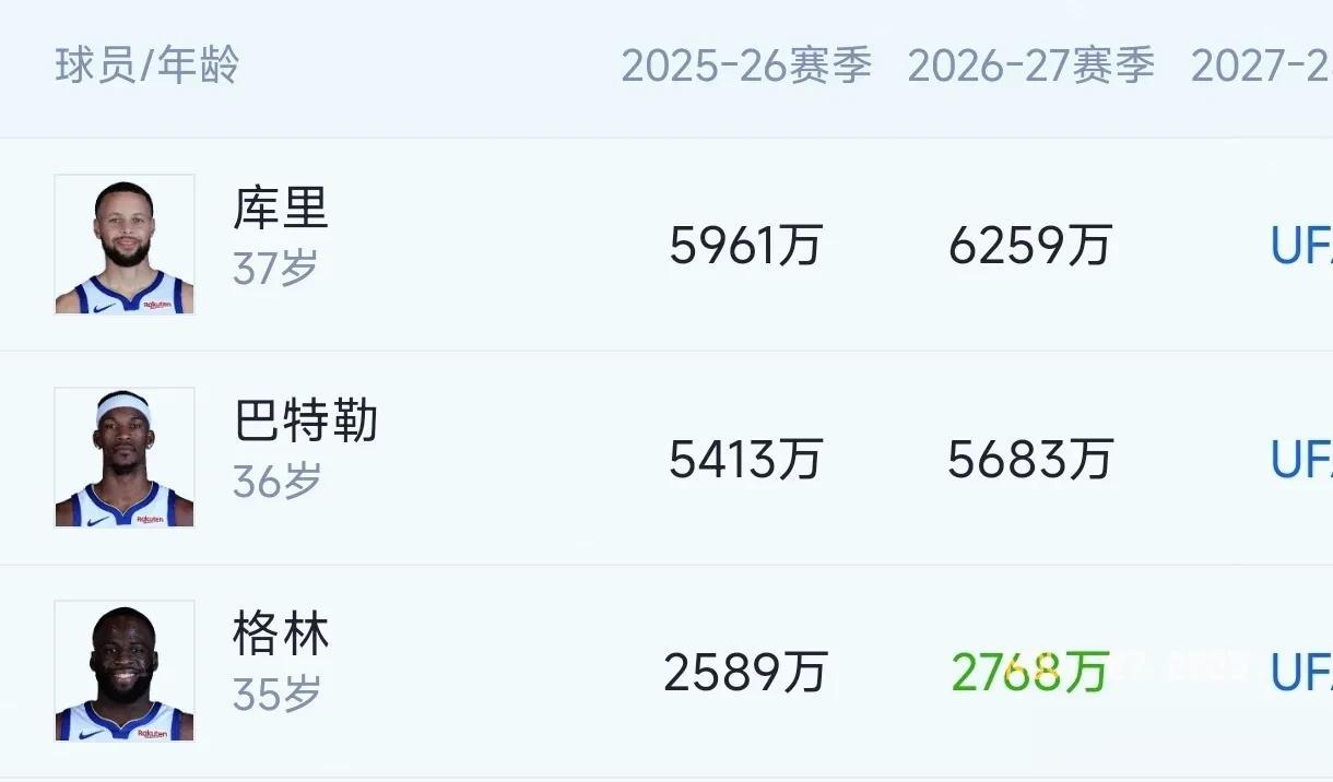 先来看一下勇士的3位核心,库里、巴特勒、德拉蒙德格林的薪水问题。库里今年的年薪是5961万美元,巴特勒是5413万美元,格林是2589万美元,3人的总薪水,加起来接近1.4亿美元。而勇士今年的薪水是2亿美元,也就是说这3位老将,拿了全队70%的薪水!更可怕的是,到了明年这个比例会进一步增加。