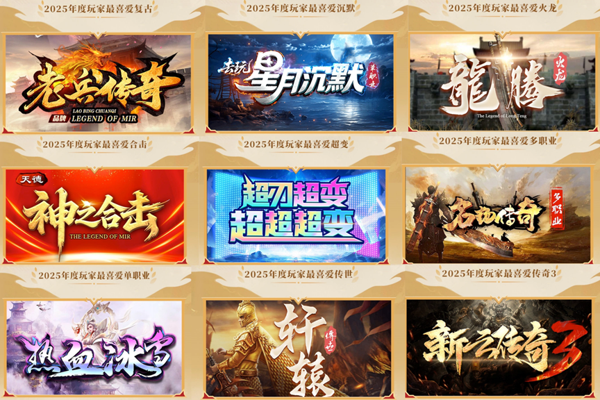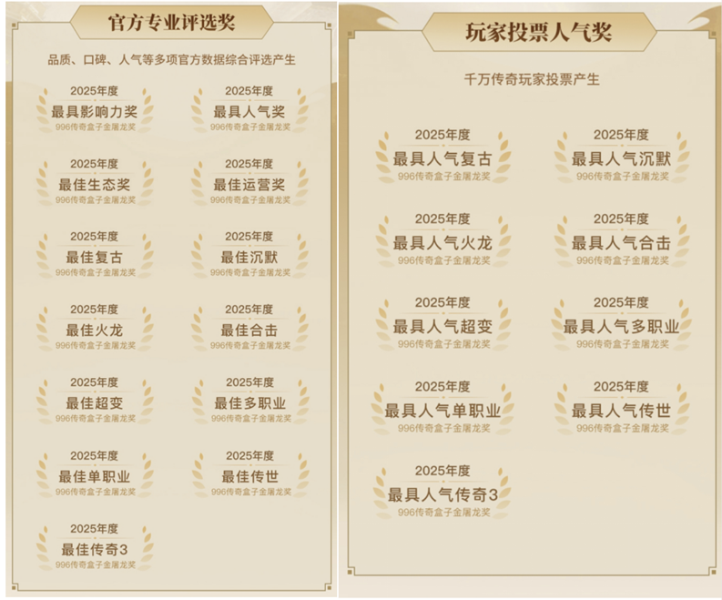 不仅如此,传奇类玩法平台的价值不止于“聚合”,更在于通过专业背书与生态运营,为传奇赛道注入长期活力。2024年末996传奇盒子主办过一场“金屠龙奖”颁奖典礼,从1200款传奇游戏、18万张玩家选票里选出最受欢迎、最成功的传奇游戏作品。而今年,在玩家中已享有“传奇界奥斯卡”美誉的2025“金屠龙奖”公布年度评选结果,标志着这场传奇游戏界盛事稳步成长为定义年度传奇大赏的风向标。本届金屠龙奖共有数十万玩家参与投票,最具人气奖项中《老兵传奇》《去玩星月沉默》《龙腾火龙》《天德神之合击》《超刃超变超超超变》分获复古、沉默、火龙、合击、超变大奖。而在官方专业评选中,《名扬传奇多职业》斩获「年度最佳影响力」和「年度最佳多职业」两项大奖,它也是「年度玩家最喜爱多职业」奖获得者。《赏金传奇》则得到官方肯定,荣获「年度最佳复古」和「年度最佳人气」奖。