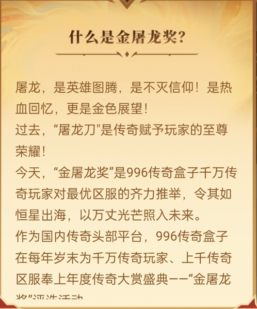 (图为金屠龙奖介绍,是千万传奇玩家都可以参与的年度盛典)