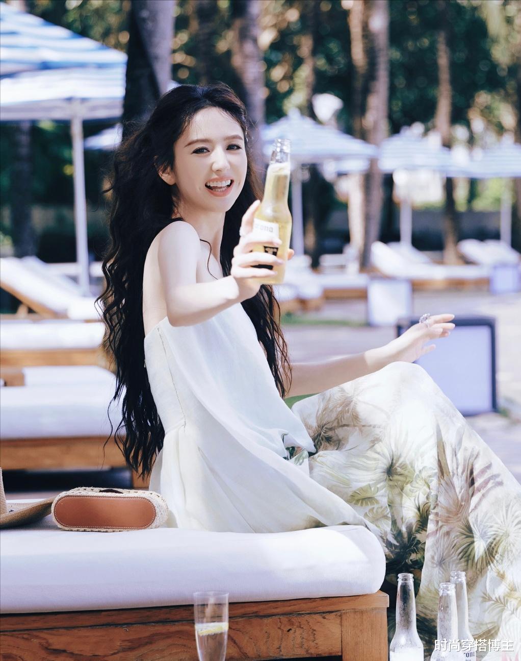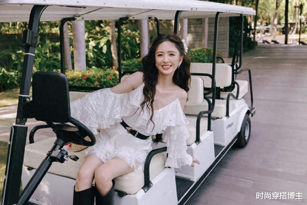 这是佟丽娅参加某活动的现场图,坐着户外的观光车开心的像个小孩子,特别是穿着一身白色吊带连衣裙裙坐在那儿,巧笑嫣然的样子立马让人眼前一亮。