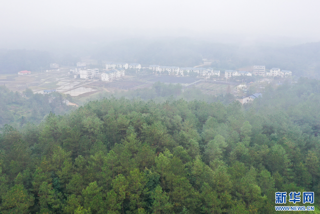 这是在长汀县水土保持科教园附近拍摄到的乡村冬日景观。晨雾中,绿色森林环抱美丽乡村(无人机照片)。新华网 肖和勇 摄