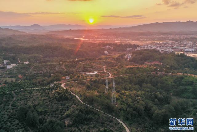 这是在长汀县三洲镇丰盈美丽生态农场拍摄到的落日景观。如今,这里月月有花开,季季有果采,昔日“火焰山”变成了“花果山”(无人机照片)。新华网 肖和勇 摄