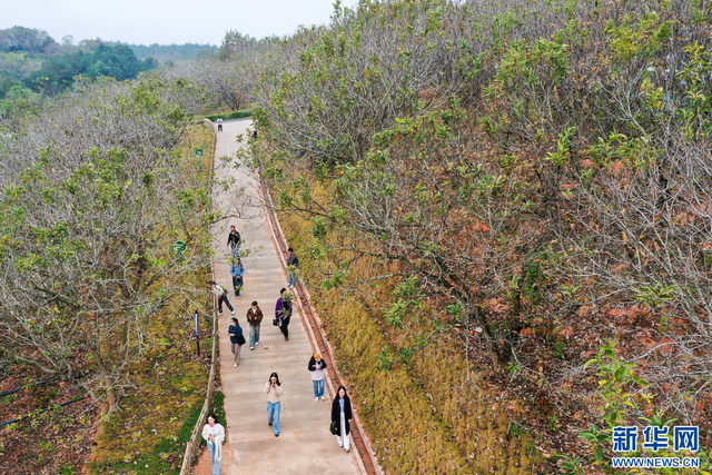 这是长汀县河田镇露湖村项公亭千亩板栗示范基地,游客在板栗林中游览观光(无人机照片)。新华网 肖和勇 摄