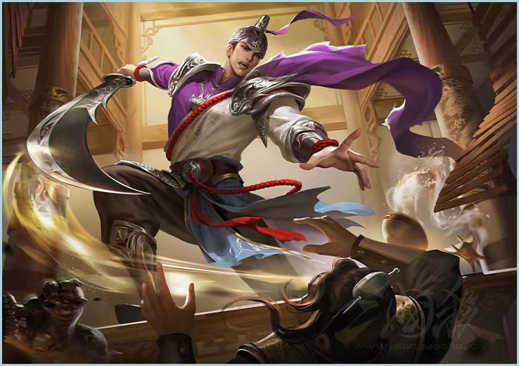 忿然作色皮肤中李通身穿紫色帽子,这种奇怪的帽子在古代是世袭爵位之人所佩戴,黄初元年(公元220年),曹丕即帝位,追赠他刚侯的谥号。下诏说:“当初袁绍大兵压境,从许昌、蔡县以南,人人都怀有异心。只有李通仗义不顾个人安危,使怀二心的人都对他服气,朕非常感激他。他不幸早逝,他儿子李基虽已承袭了爵位,仍然不足以酬劳他的殊勋。李基的哥哥李绪,以前屯驻樊城,又有功,举世都认为他的功劳很大。现在任命李基为奉义中郎将,李绪为平虏中郎将,表示特殊的优待。帽子的形状奇特,好像李通扎着一个朝天辫一般,朝天辫造型诙谐幽默,龇牙咧嘴,多用于剧中地位低下的人物。在三国演义中,李通被作者用出场秒杀的笔法去衬托马超的武艺高强。帽子上印着银白色的花纹,用一根紫色丝带盘着,丝带过长还飘在空中。李通上半身采用紫色的色彩,半截披风更加凸显李通霸气的外表,两肩的银白色护肩,手腕的银白色护腕也证明了李通的武将身份。李通的手腕和身上绑着红色的绳子,李通恰逢黄巾起义,其振臂一呼,相应云集,和周直、陈恭一起起义。红色绳子真是义军的标志。李通下半身的裙带采用蓝色设计,紫色多代表晋朝,蓝色才是魏臣的标志,但是毕竟李通被曹丕追封,所以作者考虑这个缘故在色彩上如此搭配。