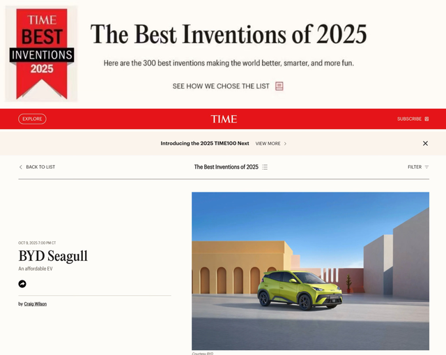 《时代周刊》年度最佳发明榜单历来被誉为“全球创新风向标”,以其严谨的评选标准与前瞻的国际视野著称。在原创性、有效性、前瞻性与影响力等多重维度的严格评审下,海鸥从来自全球的众多候选产品中脱颖而出,成为今年榜单中一颗闪亮的明星。杂志在评语中特别提到,比亚迪已在全球多地区成为家喻户晓的电动品牌,而海鸥作为其旗下最亲民的明星车型,不仅在今年6月迎来第100万辆下线,更成功驶入15个欧洲国家,以实打实的市场表现印证了小型纯电车型的全球吸引力。