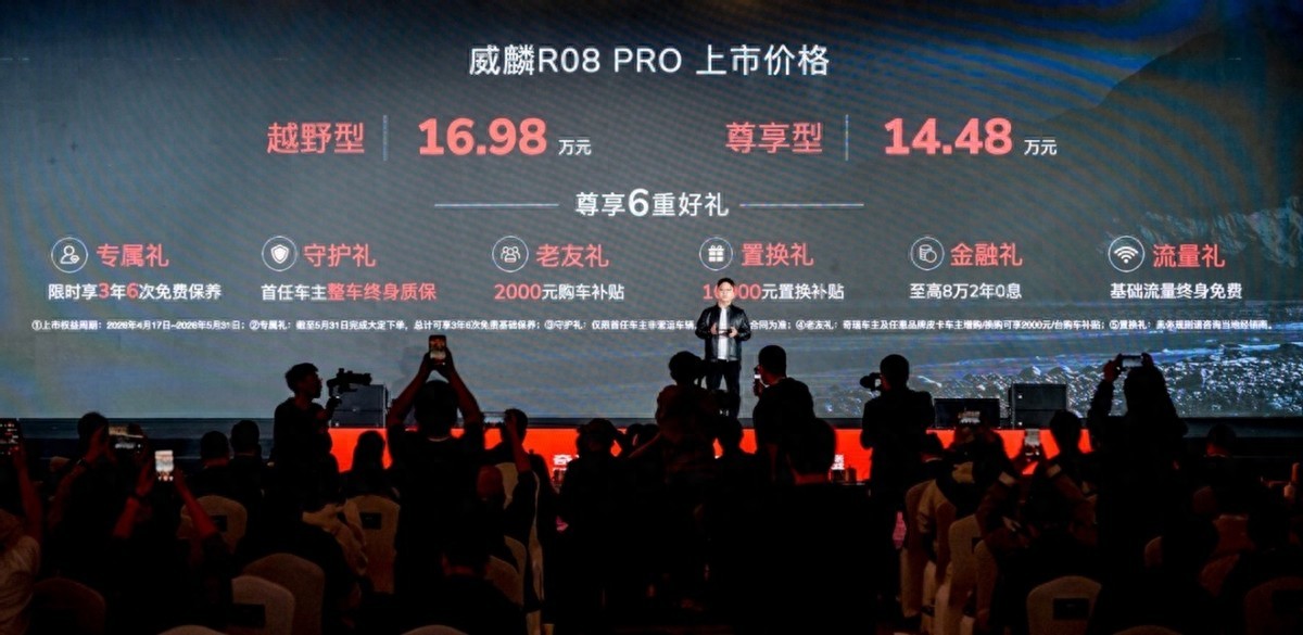 4 月 17 日,奇瑞威麟 R08 PRO 在日照正式上市,尊享型 14.48 万元、越野型 16.98 万元,以 “硬派越野 + 乘用智能” 双核心,精准切入 15 万级细分市场,直接填补该价位高端硬派越野皮卡的空白,宣告皮卡从 “工具车” 向 “全场景高端生态” 的战略跨越正式落地。