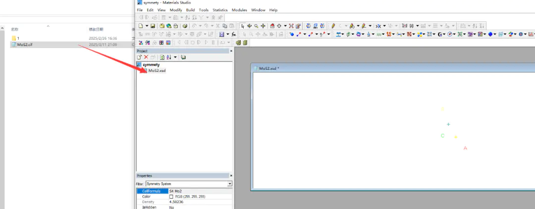 3.拖拽cif结构文件到Materials Studio中打开,示例为MoS2.cif文件。