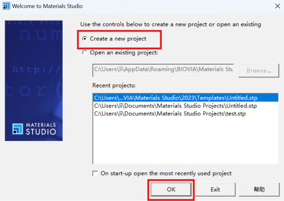 1.打开Materials Studio软件,选择Create a new project,并点击OK按钮。