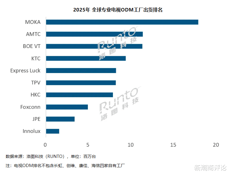 有3家专业代工厂出货量超过1000万台。BOE VT(视讯)上升2位跻身前三,2025年出货量1130万台,同比大涨37.5%,增幅为行业第一,客户包括小米、海信、华为、Vizio、LG、BestBuy等,其海外业务占比突破六成。背后的京东方是全球最大的电视面板生产商,去年出货量6810万片,出货面积5120万平方米,同比分别增长13%和12%,市占率达到26%。