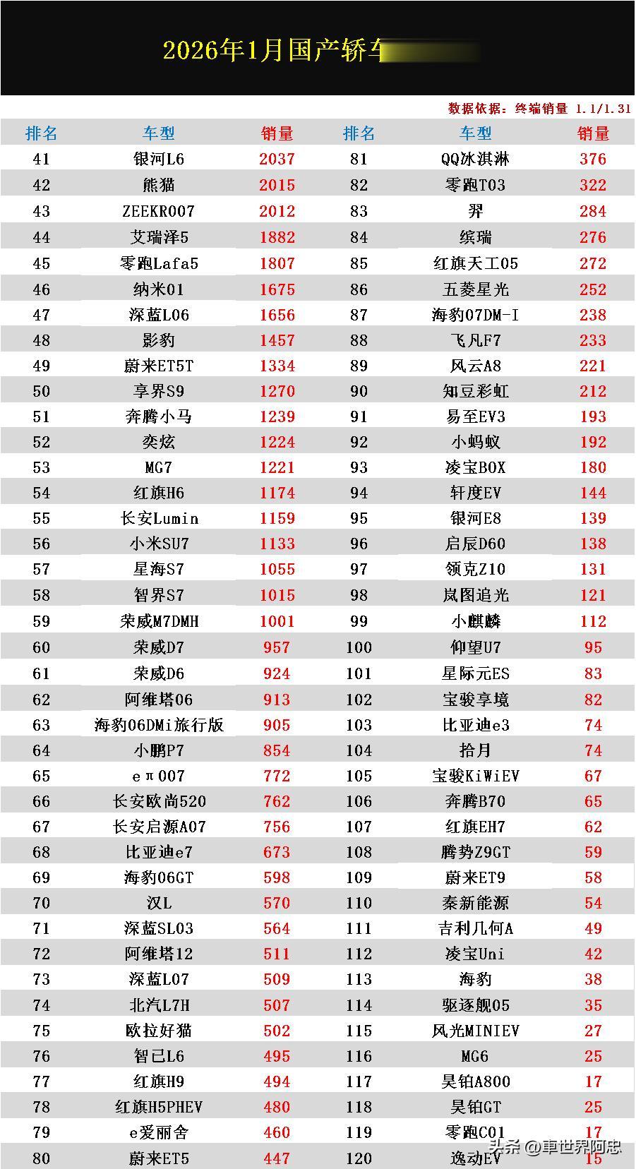 银河L6、熊猫排名均跌出榜单前四十,艾瑞泽5、纳米01、深蓝L06表现相对中规中矩,奔腾小马、小米SU7排名都下滑十分明显,尤其是小米SU7上个月销量2万+辆,来到1月份后仅卖出了1133辆,排名屈居第56。阿维塔06、小鹏P7、比亚迪e7、汉L表现也都很一般,销量都只有几百辆左右,而红旗H9、蔚来ET5、零跑T03、五菱星光等车型销量均跌至500辆以下。此外、自第100名以后,各车型表现也都不太顺利,月销量都仅有两位数,其中包括仰望U7、奔腾B70、蔚来ET9、海豹、昊铂GT等车型在内!