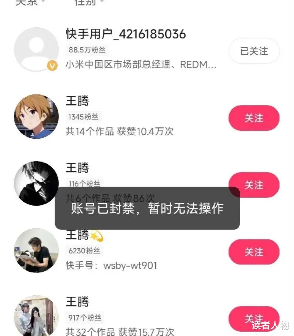 王腾微博上“小米中国区市场部总经理、REDMI品牌总经理” 的认证已经取消,抖音账号设为私密,快手账号更是显示“已被封禁”。
