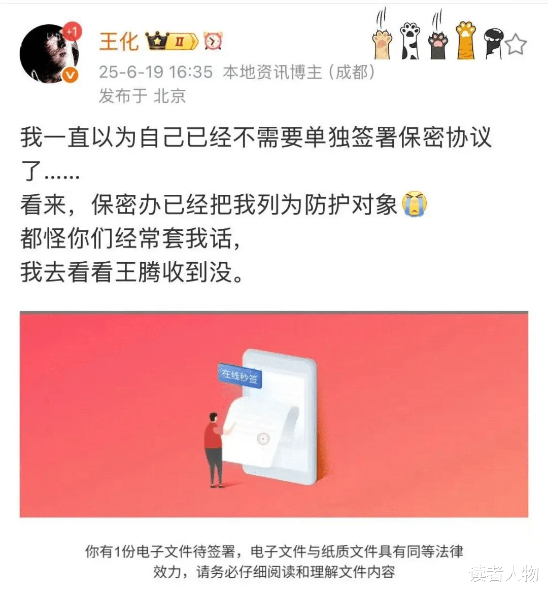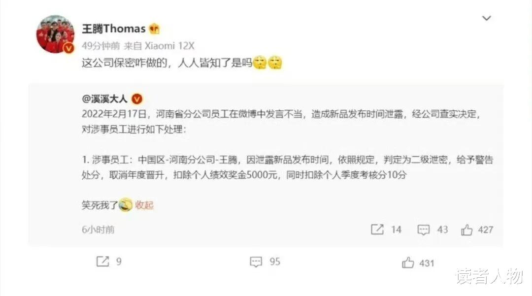到了2023年,小米公关部总经理王化晒出保密协议时特意配文:“保密办说我是重点防护对象,去看看王腾收到没。”
