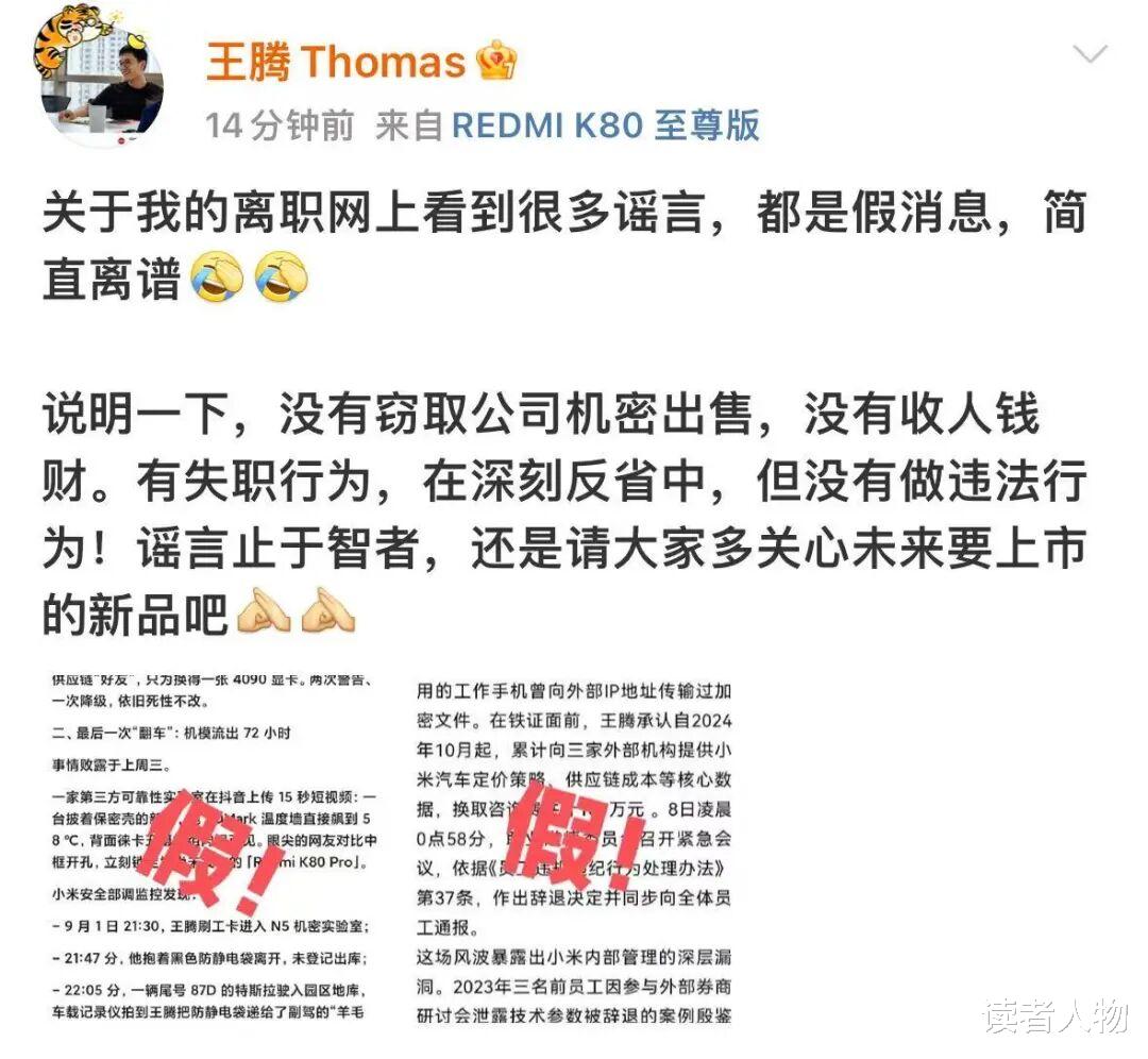 王腾再次发声,愤怒辟谣:“关于我的离职网上看到很多谣言,都是假消息,简直离谱。说明一下,没有窃取公司机密出售,没有收人钱财。有失职行为,在深刻反省中,但没有做违法行为!”