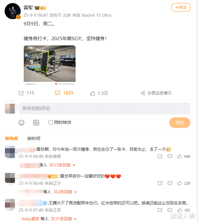 有意思的是,雷军的日常健身微博从未中断。