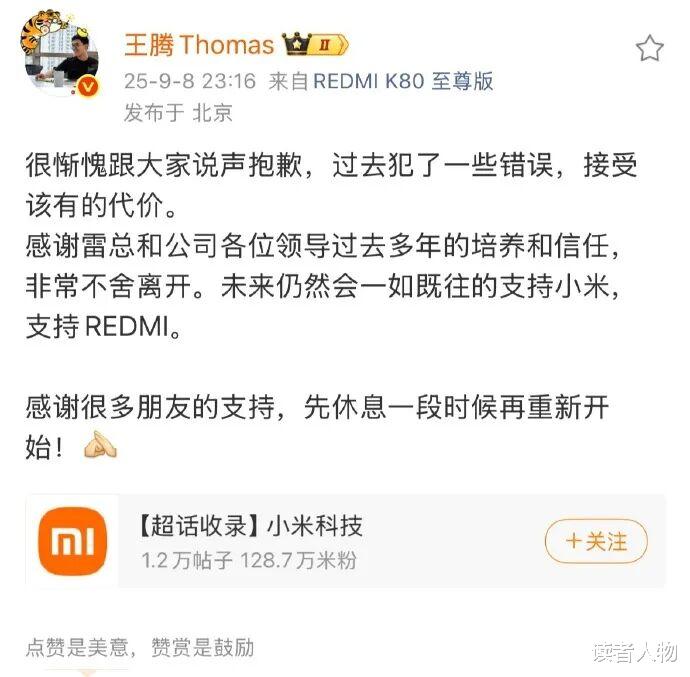 王腾在微博发布了致歉声明:“很惭愧跟大家说声抱歉,过去犯了一些错误,接受该有的代价。感谢雷总和公司各位领导过去多年的培养和信任,非常不舍离开。未来仍然会一如既往的支持小米,支持REDMI。”