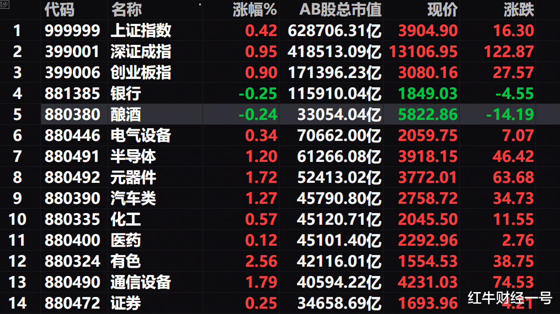 二、早盘A股前十大行业市值板块仅银行板块走低,跌幅为0.25%,从而使得沪指涨幅弱于深成指,而电气设备、半导体、元器件、通信设备等板块则纷纷走高,正是该等板块发力,从而推动了A股高开高走,另外酿酒板块一路走低,表现弱势,跌幅为0.24%,对于酿酒板块我已数次发文提示了风险因素,请大家远离酿酒板块,切不可纳入投资范围。