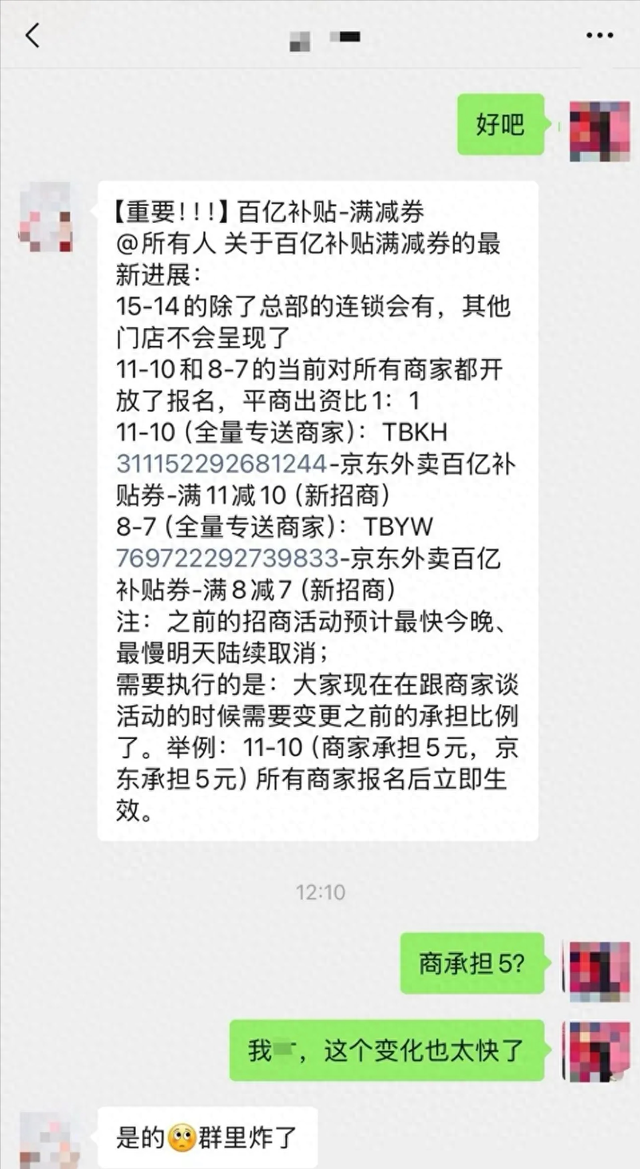 4月11日,某东外卖高调上线"百亿补贴",以"满8减7"等极致优惠迅速点燃市场。平台初期承诺全额承担补贴成本,一度让消费者和商家充满期待。然而这场狂欢仅维持一周便风向突变。平台悄然修改规则,将补贴成本转嫁给餐饮商家,要求其承担30%-50%的费用。至4月23日,商家承担比例已统一上调至50%,同时配套出台强制参与机制。这场打着"普惠"旗号的补贴活动,逐渐演变为平台向商家转嫁成本的单方面施压。