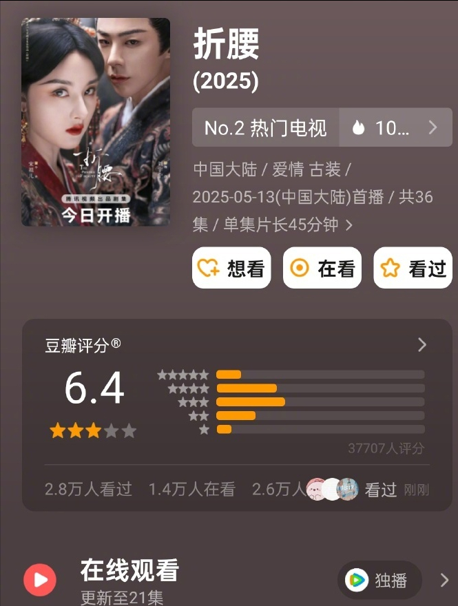 那么,你认为《折腰》的6.4分是高了还是低了?后期还会涨吗?