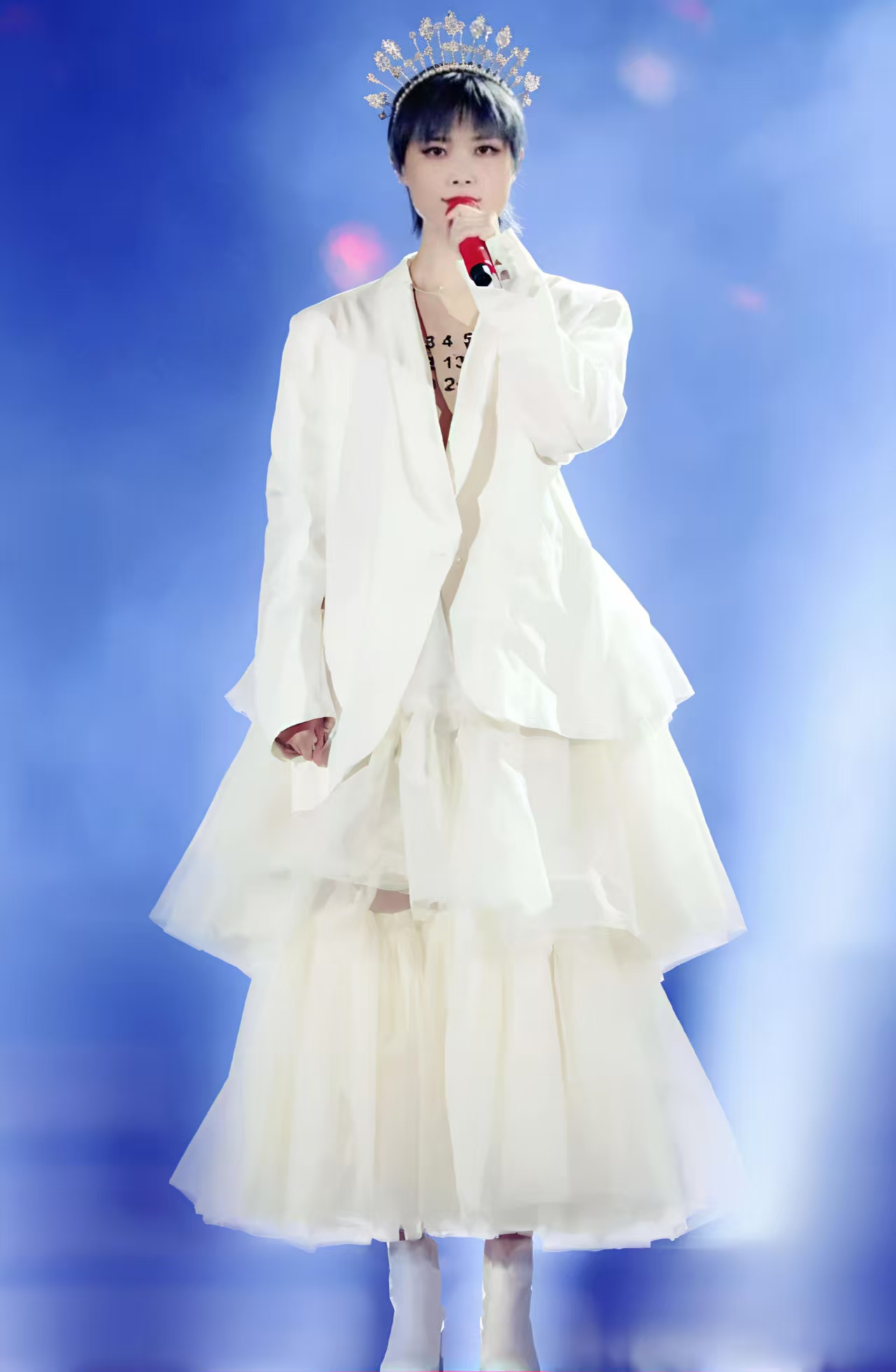 在《浪姐》的舞台上,她又一次以新形象出现——蓝色假发、抹胸连衣裙、妩媚的红唇。那是她喜欢的造型,即便仍有争议,但她已经学会不被外界声音左右。