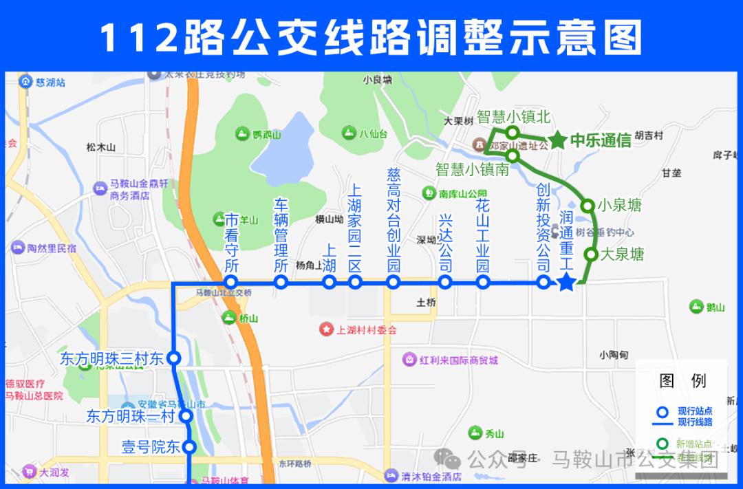 112路公交线路将由朱然文化公园—润通重工调整为朱然文化公园—中乐通信,线路走向沿银杏大道向北,经燕山路、邓家山路、中兴路,沿途增加“大泉塘、小泉塘、智慧小镇南、智慧小镇北、中乐通信”五站,其余站点不变。